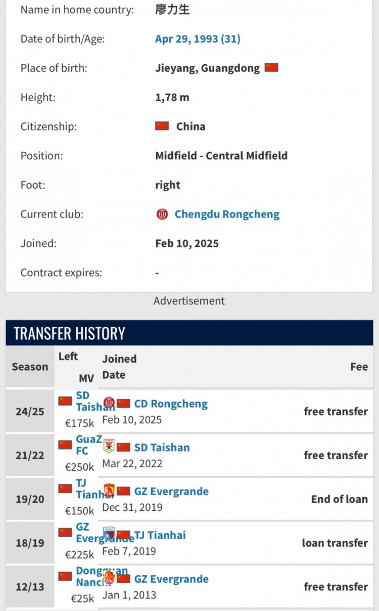 在德轉(zhuǎn)廖力生的個人頁面中,他已經(jīng)于2月10日加盟成都蓉城,但合同年限并未披露。本次廖力生屬于自由身轉(zhuǎn)會,因此成都蓉城無需支付轉(zhuǎn)會費用。