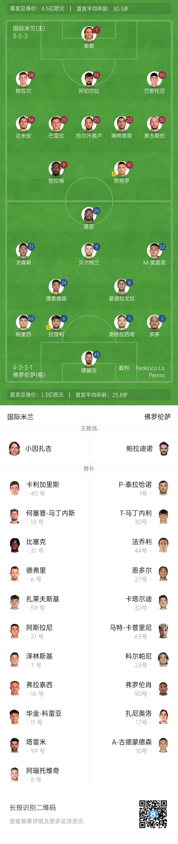 國(guó)米首發(fā):1-索默、28-帕瓦爾、15-阿切爾比、95-巴斯托尼、36-達(dá)米安、23-巴雷拉、20-恰爾汗奧盧、22-姆希塔良、30-奧古斯托、9-小圖拉姆、10-勞塔羅