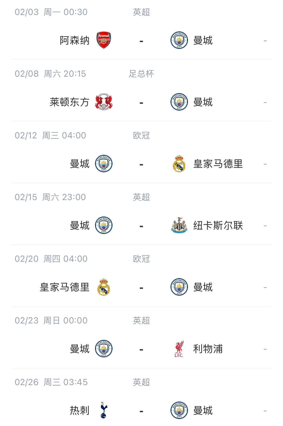 曼城2月首戰(zhàn)將客戰(zhàn)阿森納,對陣皇馬的兩場歐冠附加賽分別在2月12日和20日進行,中間15號需對陣紐卡,踢完皇馬的3天之后將對陣目前的英超榜首利物浦。
