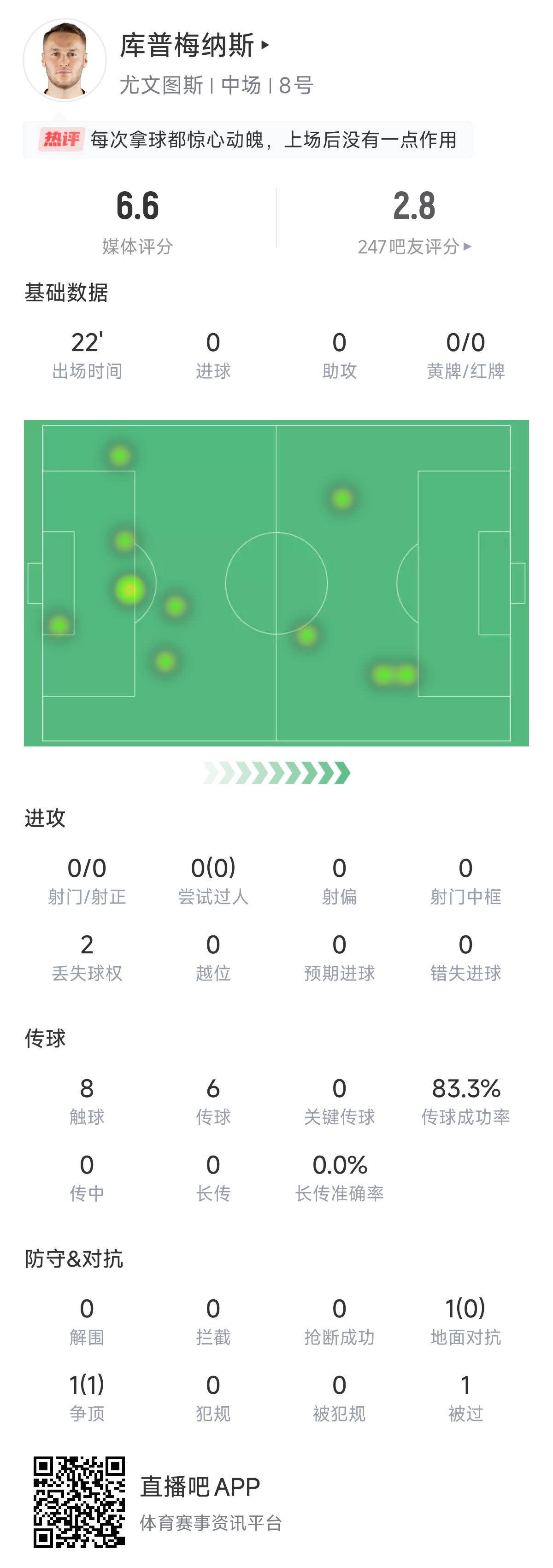 今天的比賽庫(kù)普梅納斯出戰(zhàn)26分鐘(含4分鐘補(bǔ)時(shí)),僅有8次觸球,其中2次丟失球權(quán)。他的多項(xiàng)數(shù)據(jù)掛零,1次對(duì)抗也沒(méi)成功。賽季即將進(jìn)入沖刺期,這位26歲的荷蘭中場(chǎng),能否找回自己上賽季的神勇?tīng)顟B(tài)呢?