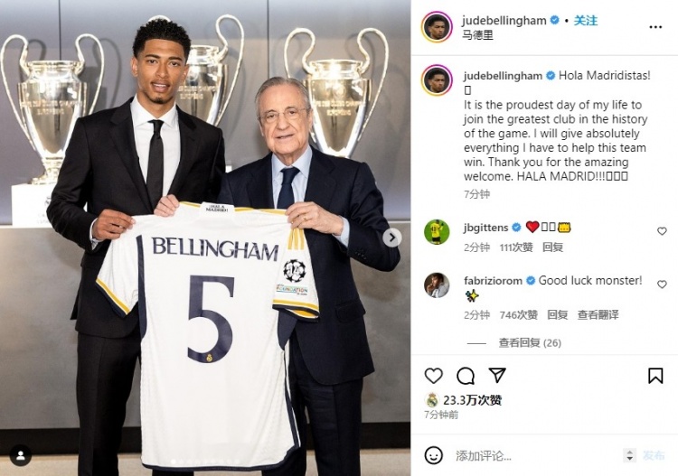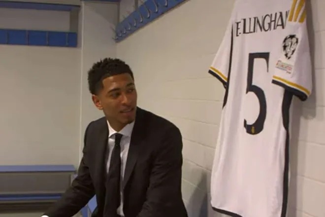 2023年夏天,貝林厄姆加盟皇馬,穿上了偶像齊達(dá)內(nèi)在皇馬穿過的五號球衣。那一天,接受采訪的貝林厄姆非常激動地說,齊達(dá)內(nèi)是他的偶像,能夠在皇馬和偶像穿同樣號碼的球衣,他非常感動,希望自己能夠成為皇馬新五號。