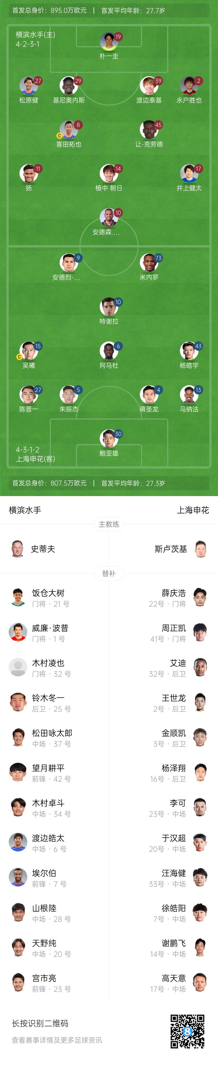 上海申花替補:22-薛慶浩、41-周正凱、2-王世龍、3-金順凱、16-楊澤翔、32-艾迪、7-徐皓陽、14-謝鵬飛、17-高天意、20-于漢超、23-李可、33-汪海健