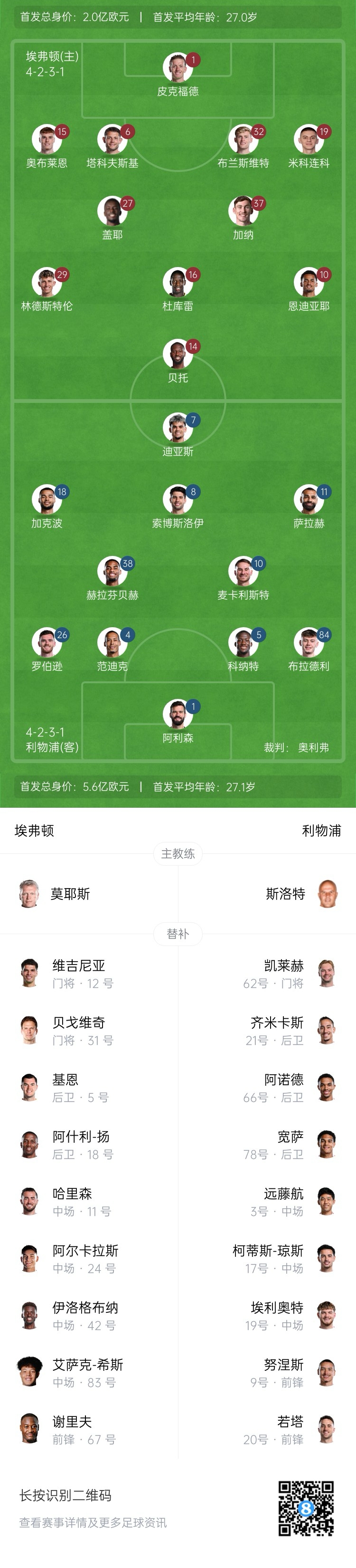 利物浦首發(fā):1-阿利森、4-范迪克、5-科納特、26-羅伯遜、84-布拉德利、38-赫拉芬貝赫、8-索博斯洛伊、10-麥卡利斯特、7-路易斯-迪亞斯、11-薩拉赫、18-加克波