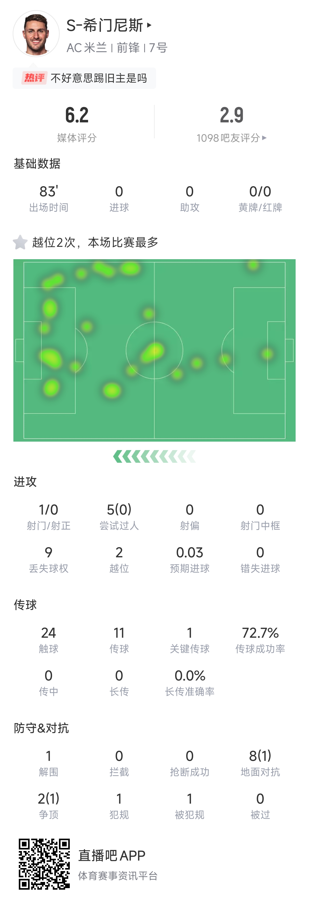 本場對陣舊主,希門尼斯出戰(zhàn)83分鐘僅有1腳射門,沒有射正。他5次過人0成功,8次對抗1成功,還有2次越位。在24次觸球的數(shù)據(jù)中,希門尼斯9次丟球權(quán),11次傳球72%成功率,包含一次關(guān)鍵傳球。
