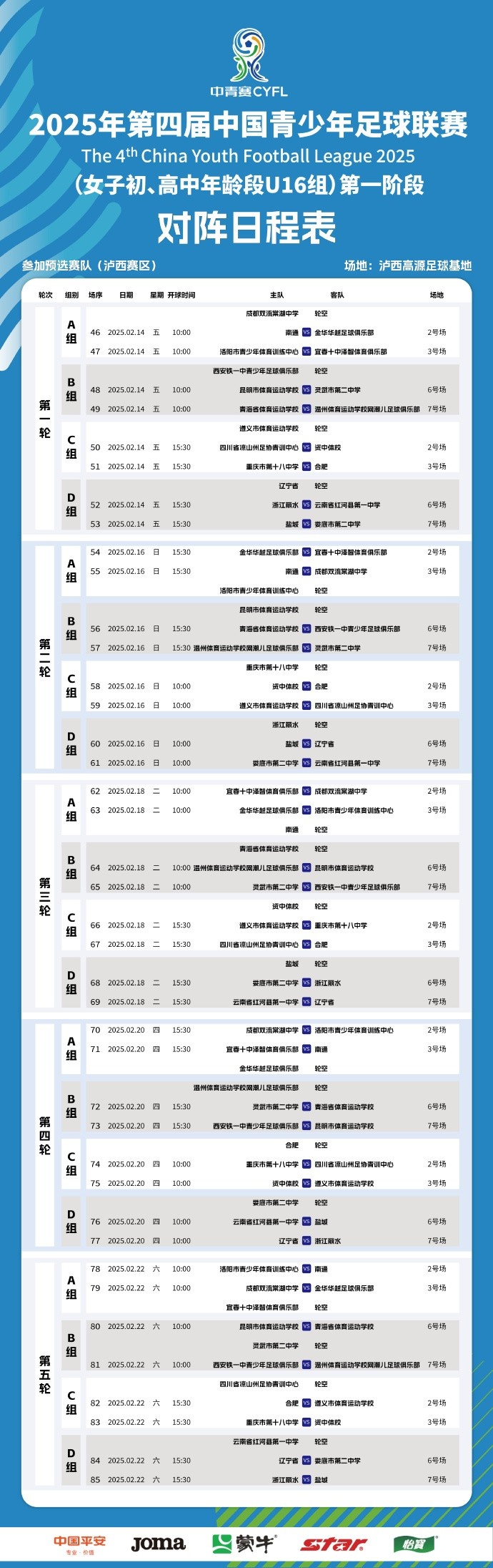 2025年第四屆中國青少年足球聯(lián)賽(女子初、高中年齡段U16組)第一階段競(jìng)賽日程公布