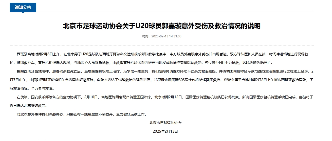 西班牙當地時間2月6日上午,在北京男子U20足球隊與西班牙阿爾科文達斯俱樂部隊教學比賽中,中方球員郭嘉璇意外受傷并出現昏迷。雙方球隊醫(yī)護人員在第一時間沖進場地進行現場救護,隨即救護車、直升機相繼抵達現場,當地醫(yī)護人員緊急搶救,由救援直升機轉運至西班牙當地權威腦神經??漆t(yī)院救治。經過近4小時全力搶救,醫(yī)院診斷為腦死亡。