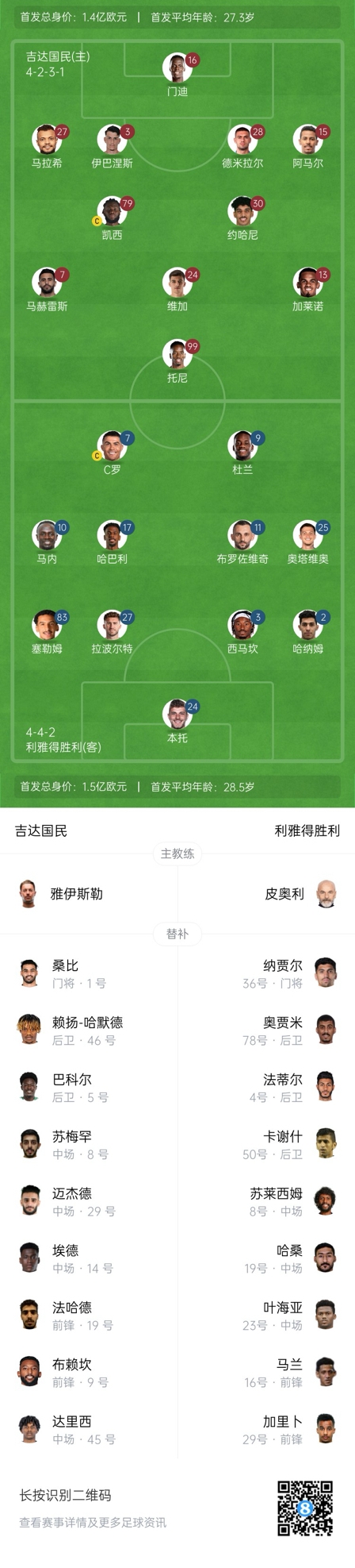 吉達國民首發(fā):16-愛德華-門迪、27-馬加希斯、3-伊巴涅斯、28-德米拉爾、15-阿馬爾、79-凱西、30-約哈尼、7-馬赫雷斯、24-加布里-維加、13-加萊諾、99-伊萬-托尼