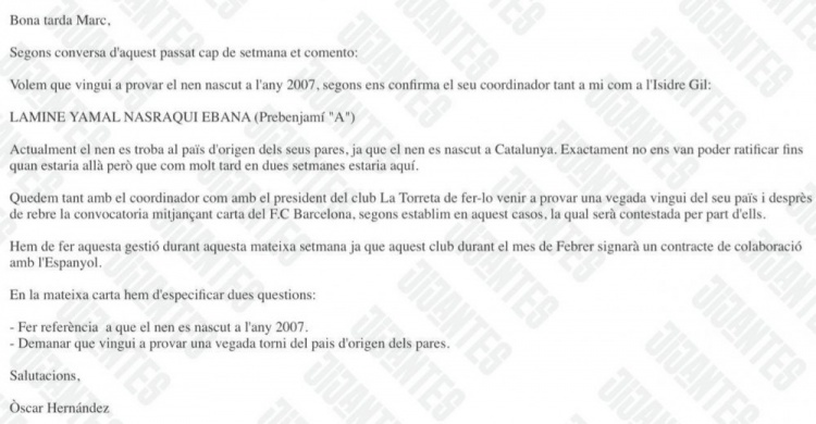 突然,他得知CF La Torreta將在2月份簽署一份與西班牙人的合作協(xié)議。他意識到了潛在的風險,并通過電子郵件通知了前拉瑪西亞的協(xié)調(diào)員Marc Serra。必須盡快對亞馬爾進行試訓并將他鎖定。