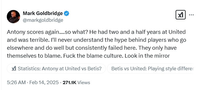 英國著名曼聯(lián)球迷頻道The United Stand的主理人Mark Goldbridge對此表示道:“安東尼又進球了...那又怎么樣?他在曼聯(lián)待了2年半時間,表現(xiàn)很糟糕。我永遠(yuǎn)無法理解那些去其他地方表現(xiàn)很好的球員背后的炒作,不過他們總是在這里失敗。他們只能怪自己,去他*的責(zé)備文化,照照鏡子吧。”