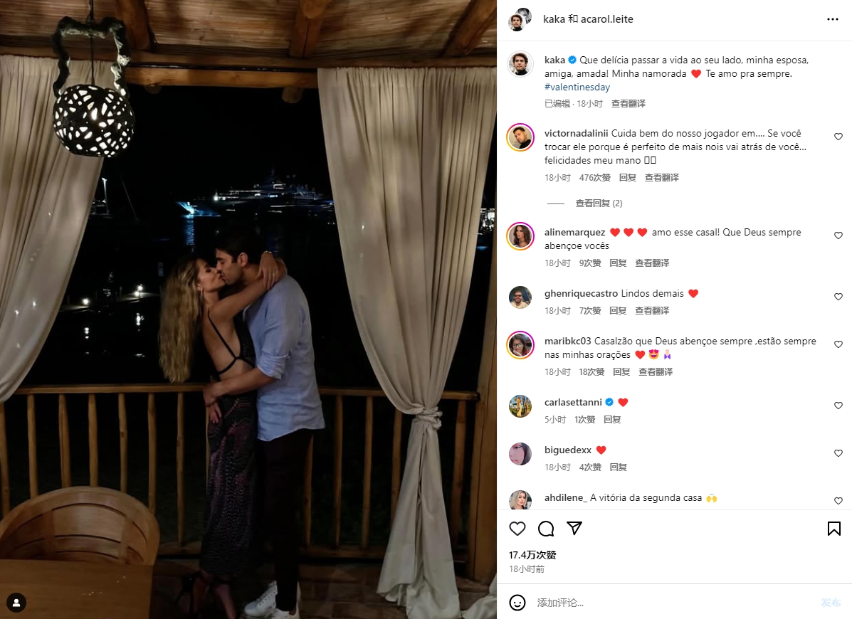 02月15日訊 情人節(jié),卡卡社媒曬出與妻子卡洛琳娜(Carolina Batista Leite)親吻照。同時(shí)卡卡寫道:我的妻子、朋友、愛人,能在你身邊度過一生非常開心。永遠(yuǎn)愛你。 標(biāo)簽: 足球 西甲 意甲