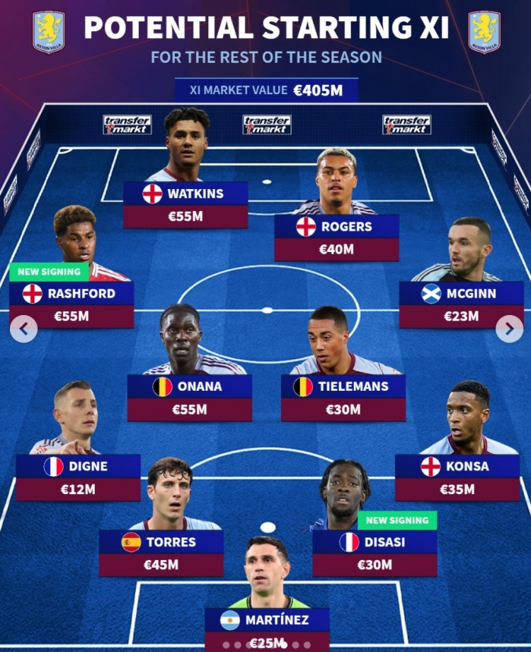 中場:拉什福德(5500萬)、奧納納(5500萬)、蒂萊曼斯(3000萬)、麥金(2300萬)