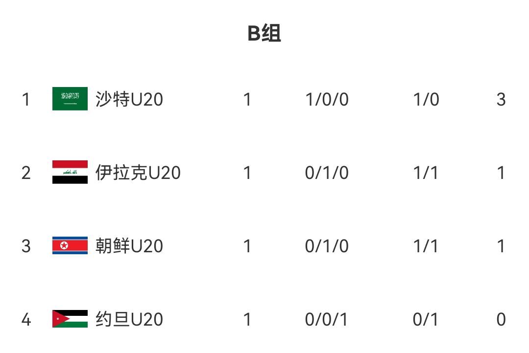 在8強(qiáng)戰(zhàn)中,國足所在的A組前二將與B組前二交叉對陣,目前B組僅進(jìn)行了一輪比賽,沙特U20暫居第一。