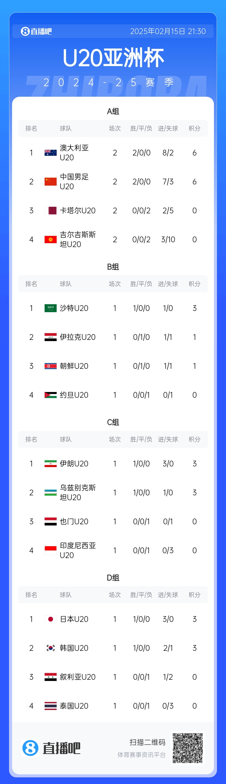 02月15日訊 U20亞洲杯A組兩輪戰(zhàn)罷,中國U20兩戰(zhàn)全勝,2-1卡塔爾、5-2吉爾吉斯斯坦,積6分已經(jīng)提前一輪出線。