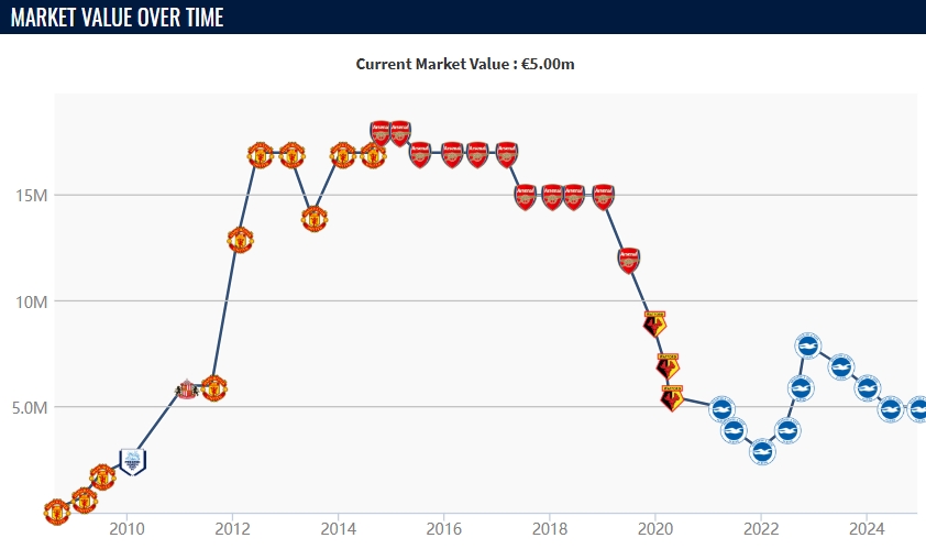 維爾貝克現(xiàn)年34歲,出自曼聯(lián)青訓(xùn),球員在2014年以2000萬歐元轉(zhuǎn)會(huì)費(fèi)轉(zhuǎn)投阿森納。維爾貝克在2019年自由身轉(zhuǎn)會(huì)至沃特福德后,布萊頓于2020年10月將其簽下,并效力至今。本賽季這位英格蘭前鋒代表球隊(duì)英超出場(chǎng)19次,打進(jìn)6球并有4次助攻。目前球員德轉(zhuǎn)身價(jià)為500萬歐元。