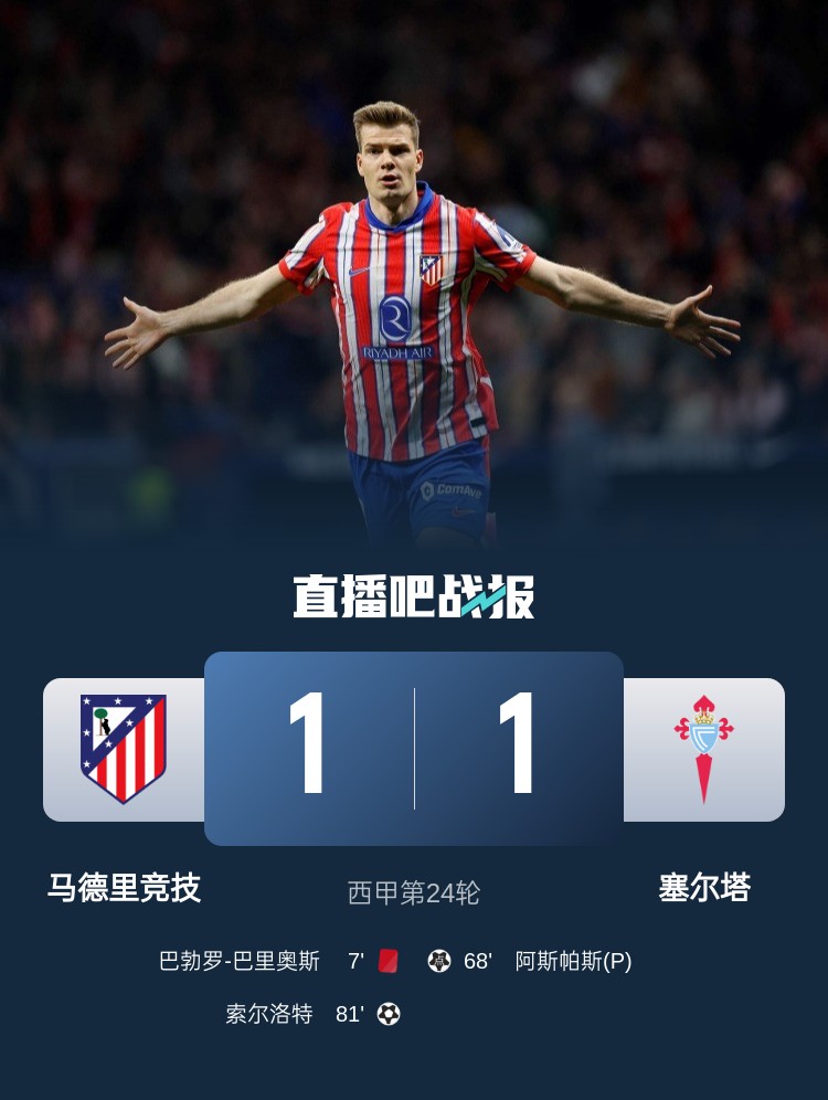 西甲-十人馬競(jìng)1-1塞爾塔落后榜首1分 索爾洛特建功阿斯帕斯點(diǎn)射
