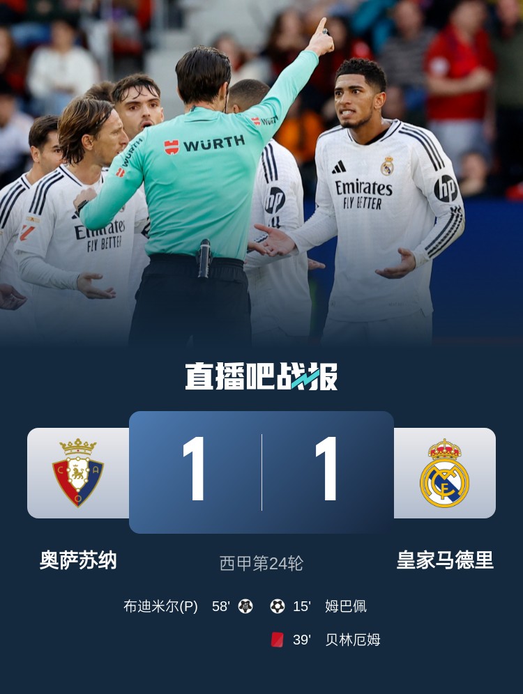 判罰爭(zhēng)議不斷!皇馬本輪1-1戰(zhàn)平奧薩蘇納,姆巴佩破門(mén),貝林厄姆染紅。